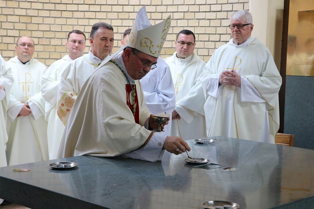 Uslijedila je molitva Litanija svih svetih te čitanje povelje posvete crkve, nakon čega je biskup pohranio relikvije bl. Stepinca u oltar u znak povezanosti s nebeskom Crkvom. Izmolio je posvetnu molitvu, moleći da Bog posveti crkvu i oltar kao mjesto žrtve i molitve. Potom je blagoslovljenim uljem pomazao oltar na pet mjesta, kao i dvanaest manjih križeva koji su postavljeni u crkvi. Na oltar su potom stavljene posude sa žarom na koji je biskup stavio tamjan koji simbolizira molitve koje se uzdižu Bogu i okadio oltar. Zatim je đakon Mislav Juraković okadio biskupa i vjernike koji čine živu Crkvu – Tijelo Kristovo. Na kraju je oltar pripremljen za slavlje mise: prekriven je oltarnikom te su postavljene svijeće i cvijeće. Župnik Jurić je od biskupa preuzeo svijeću kao simbol svjetla Kristova kojom je upalio oltarne i uskrsnu svijeću te je osvijetljena cijela crkva. Zatim su prineseni darovi za misu koja je nastavljena uobičajenim tijekom.
