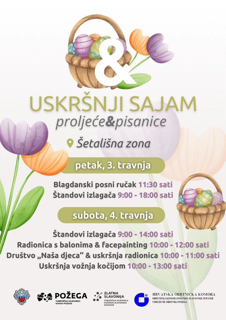 Uskršnji sajam održat će se u petak, 3. travnja i subotu, 4. travnja u šetališnoj zoni u Požegi. Posjetitelje očekuje više od 40 izlagača s bogatom ponudom domaćih proizvoda, rukotvorina, suvenira, pisanica i cvijeća.