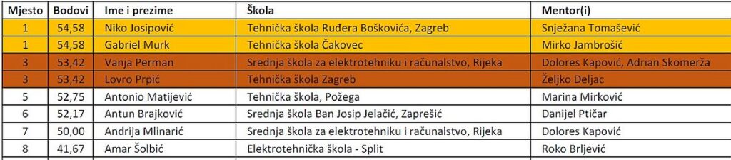Učenik Antonio Matijević iz Tehničke škole Požega, 4.f razred, u kategoriji Osnove informatike (strukovne škole) osvojio je izvrsno 5. mjesto, odnosno 3. mjesto po rezultatu jer pojedini učenici imaju isti broj bodova, dok je Andrija Razum, 4.f razred, osvojio odlično 11. mjesto. Njihova mentorica je prof. Marina Mirković. Antonio je samo 1,83 boda imao manje od prvoplasiranih učenika.