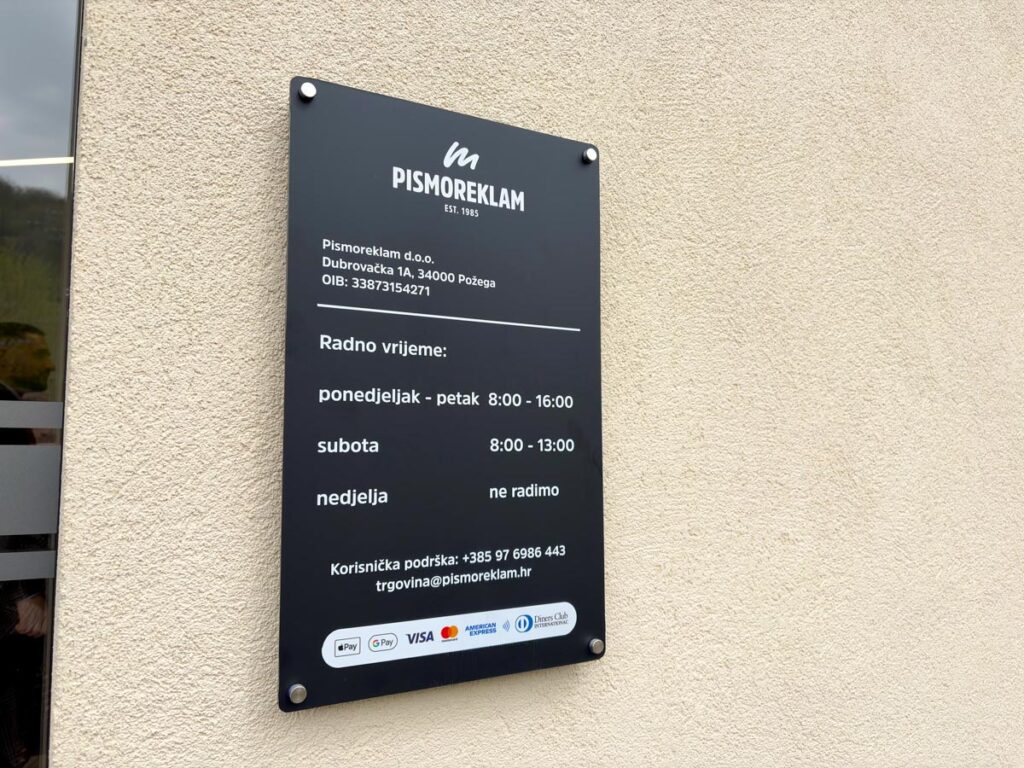 Radno vrijeme tijekom tjedna od ponedjeljak do petak je od 8 do 16 sati, dok subotom rade od 8 do 13 sati. Više informacija možete dobiti putem pismoreklam.hr ili .